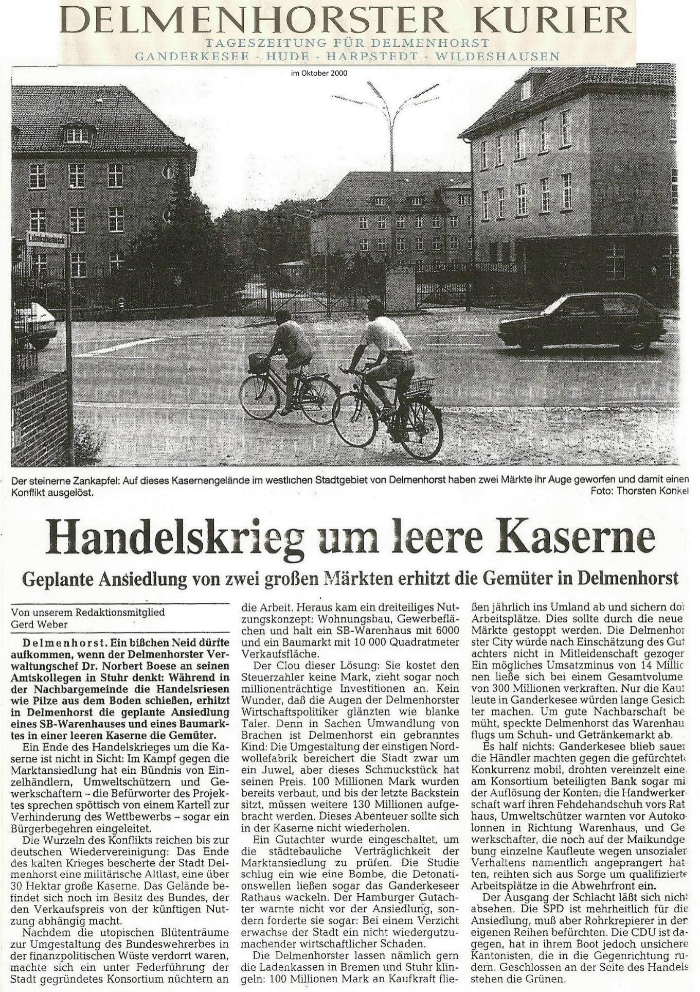 Ein öffentlicher Streit entsteht in der Stadt über die Erhaltenswürdigkeit einer Wallnussbaumallee im Gelände der abgerissenen Caspari-Kaserne. (Delmenh. Kreisblatt am 10.03., am 14.03. Bericht 1 - Bericht 2 , am 21.03. , Weser Kurier) |