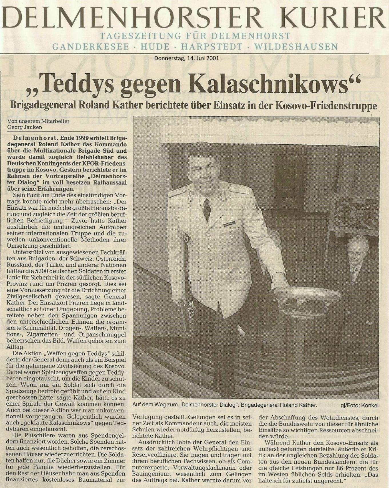 Brigadegeneral Roland Kather berichtet bei der 9. Veranstaltung des Delmenhorster Dialogs über den Einsatz des Deutschen Kontingents der KFOR-Friedenstruppe im Kosovo. (Delmenh. Kreisblatt, Weser Kurier) Kommandeurwechsel beim Nachschubbataillon 11: Oberstleutnant Leonard Hoor folgt Oberstleutnant Ulrich Gudat. (Delmenh. Kreisblatt, Weser Kurier) |