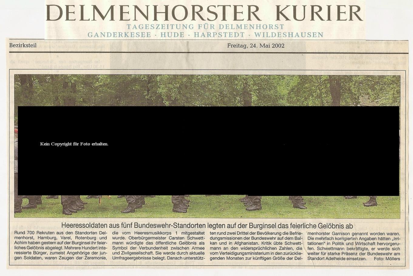 Für 180 Rekruten niedersächsischer Heerestruppen veranstaltet das Instandsetzungsbataillon 11 ein Feierliches Gelöbnis auf der Delmenhorster Burginsel. Die Gelöbnisrede hält Oberbürgermeister Jürgen Thölke. (Delmenh. Kreisblatt, Delme Report , A-Eins, Weser Kurier) Beim nachfolgenden Empfang gibt der Oberbürgermeister die definitive Entscheidung aus Berlin zum Truppenabbau in Delmenhorst bekannt. (Delmenh. Kreisblatt) |