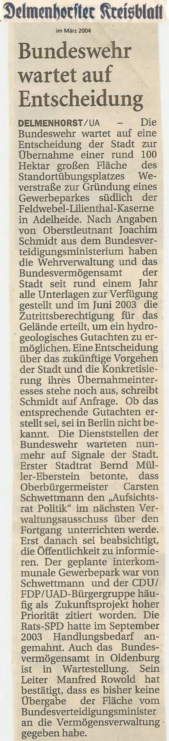 Die Stadtführung und Wirtschaftsvertreter bemühen sich in Berlin und Hannover vergeblich um eine Rücknahme der Entscheidung, den Bundeswehrstandort Delmenhorst zu verkleinern. (Delmenh. Kreisblatt am 24.02. , am 09.03. u. am 10.03. , Weser Kurier am 24.02. u. am 10.03., Delme Report) |