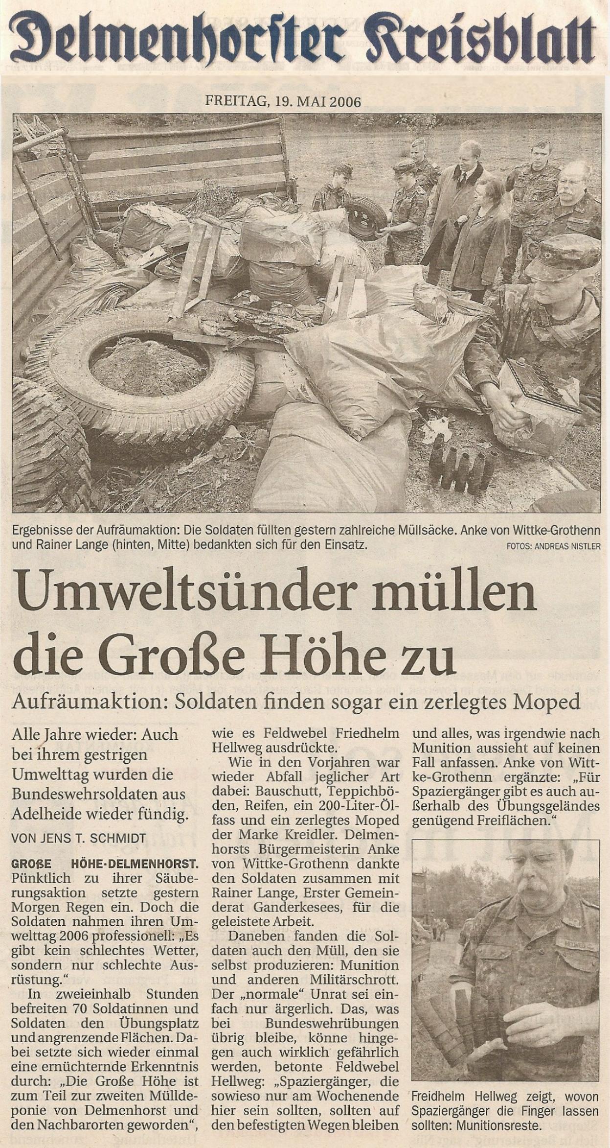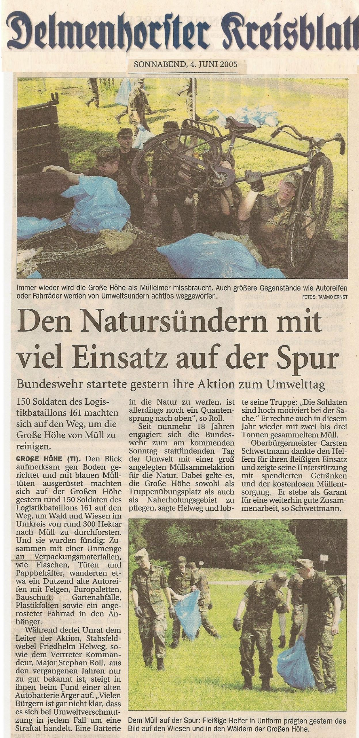 Adelheider Soldaten beteiligen sich an einer Umweltaktion auf der Großen Höhe. Der Delmenhorster Sitz der Standortverwaltung soll gefährdet sein. Über beides berichtet das Delmenh. Kreisblatt. |