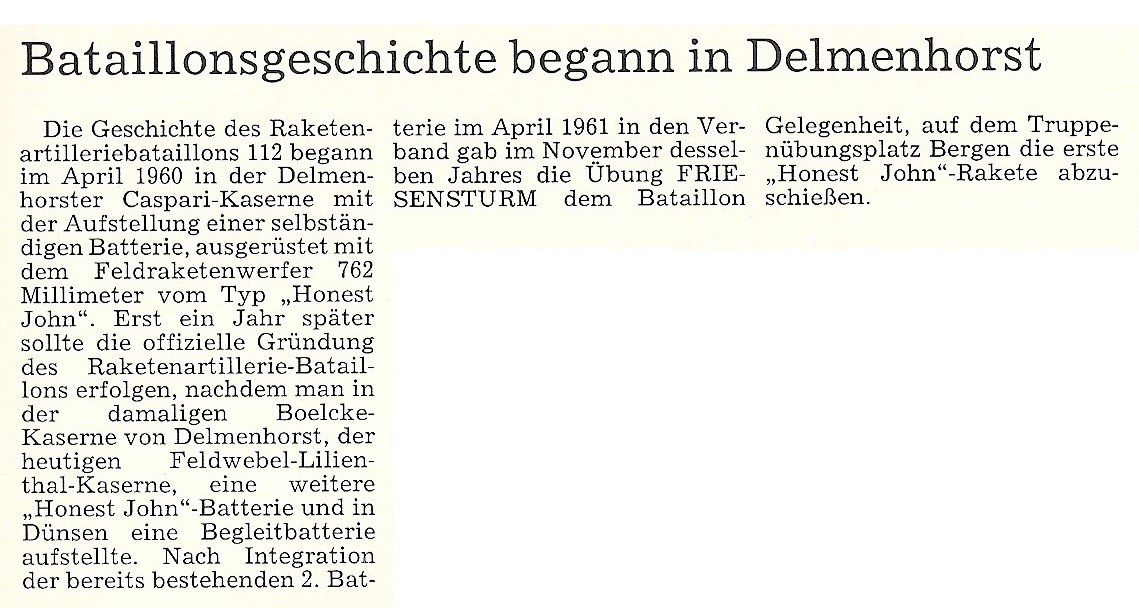 Die Geschichte der Raketenartillerie in Delmenhorst beginnt am 16.04.1960 mit dem Einzug der ersten Soldaten der 2. Batterie (Bttr) in die ehem. Caspari-Kaserne (BtlGeschichte in DEL). Hauptmann Scheele ist Chef.